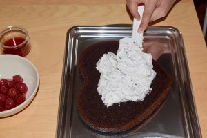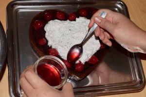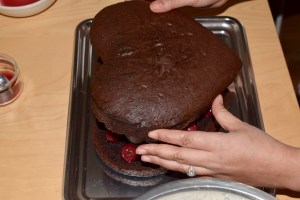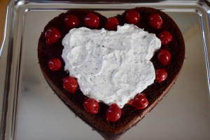 8. Etalez la moitié de la crème au centre du disque et mettre des cerises ( pour ma part, j’ai pris des griottes) et du jus sur les bords. reconstituez le gâteau puis glacé le du reste de la crème. Décorez-le. moi j’ai rajoutez des copeaux de chocolat et des cerises.