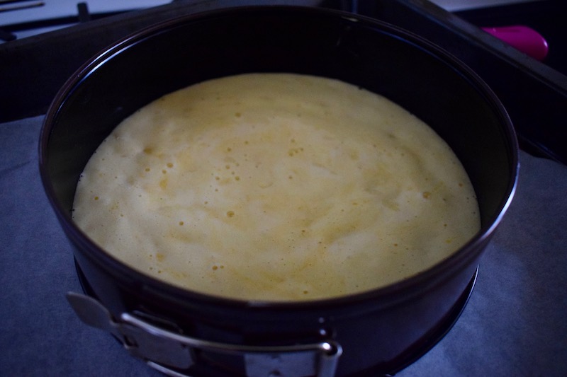 - Préparer un fond de biscuit de 22 cm de diamètre. J’ai choisi une génoise pour bavarois (super recette de Cuisine Actuelle ici )