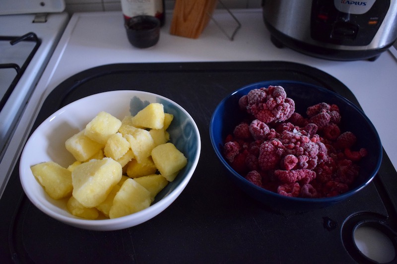 A la base c’est un Passion Framboise mais malheureusement je n’ai pas trouvé de pulpe de fruits de la passion surgelé donc j’ai choisi de faire à l’ananas (quelle grave erreur lol vous verrez pourquoi après).