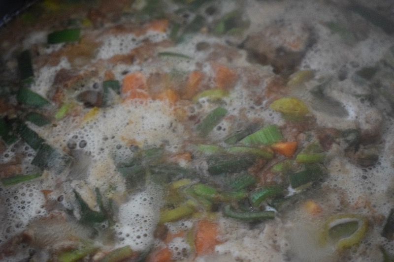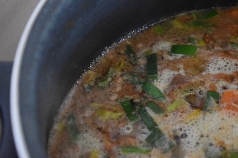 Quand ça arrive à ébullition, baisser le feu et clarifier pendant min 45mn. Le blanc d’œuf va coaguler. Cette couche de protéines va servir de filtre et attraper toutes les particules et impuretés de la marmite.