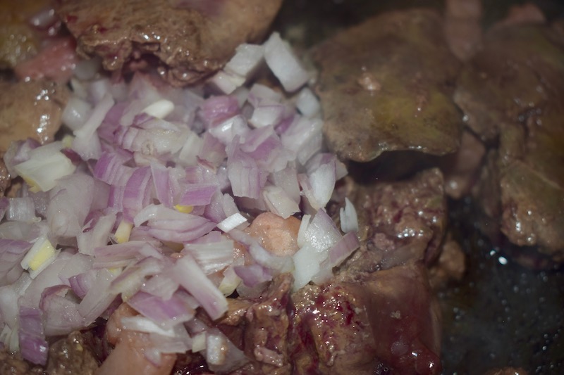 - Faire sauter les lobes de foie de volaille escalopés dans le lard gras fondu et ajouter l’échalote, les herbes aromatiques et flamber au cognac