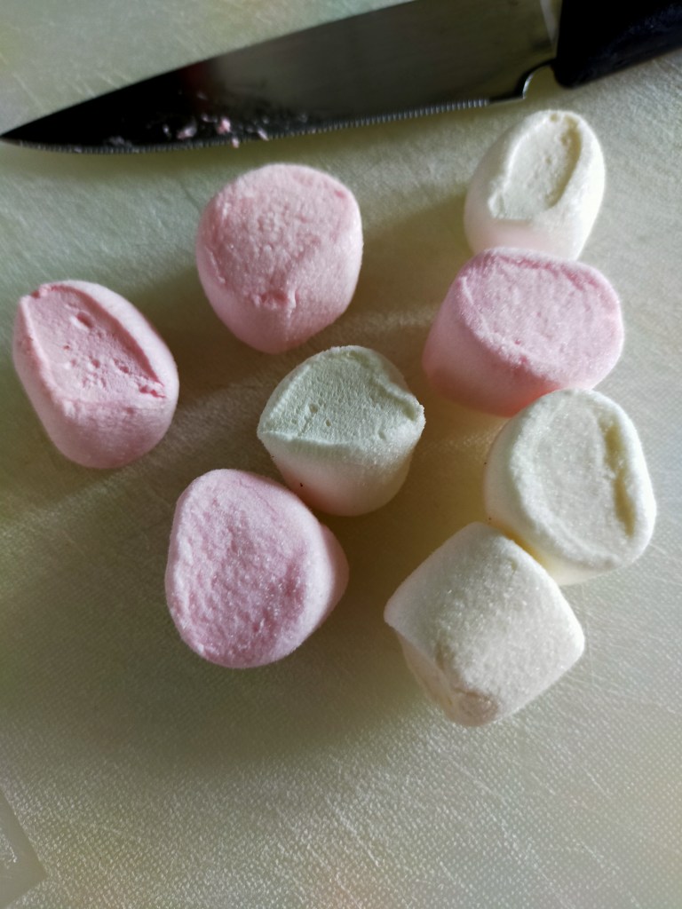 - Pendant ce temps, trier les Smarties par couleur et couper 3-4 chamallows en 2
