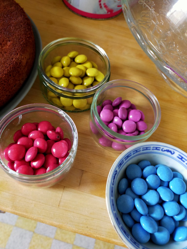- Etaler la ganache sur le gâteau refroidi. Puis décorer avec les bonbons. Les Smarties pour l’arc-en-ciel et les chamallows pour les nuages.