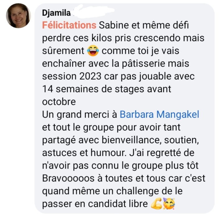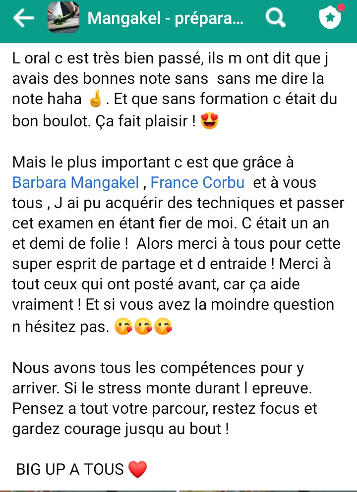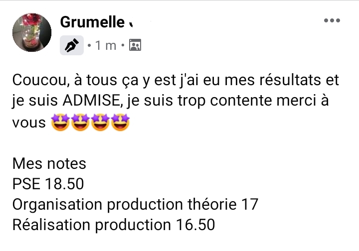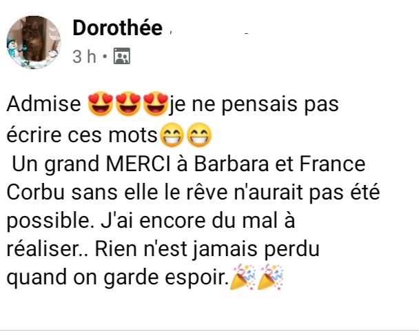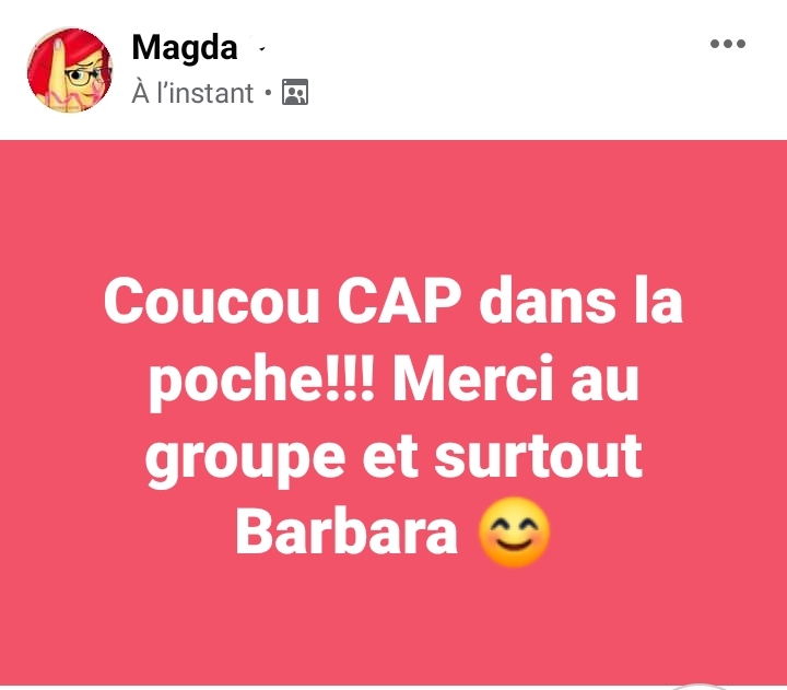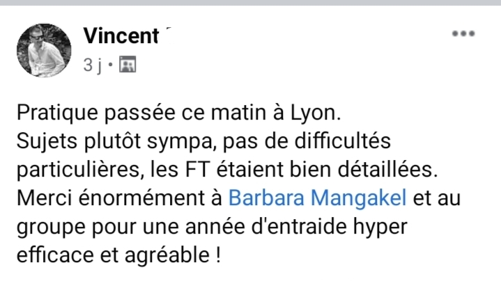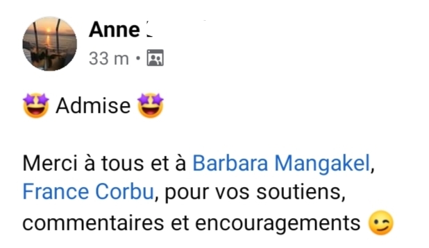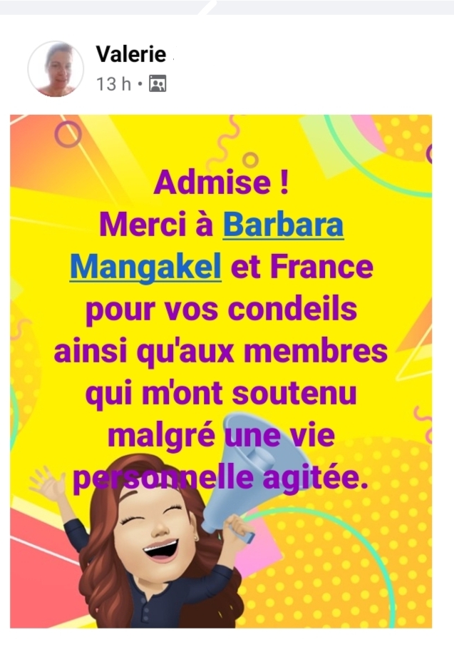 Ce qui en fait sa force c’est avant tout son esprit solidaire, joyeux et dynamique ! Ici on partage ses avancées dans la préparation des examens, mes aussi ses doutes et ses espoirs. Ici on remonte le morale des troupes, on encourage, on demande conseil etc. Il y a toujours une oreille attentive pour te répondre. C’est un véritable lieu d’échanges inespéré, pour les candidats libres solitaires. Une bouée pour ne pas tout laisser tomber … C’est tout cela que j’ai voulu insuffler dès la création de ce groupe. Je suis très heureuse du résultat.