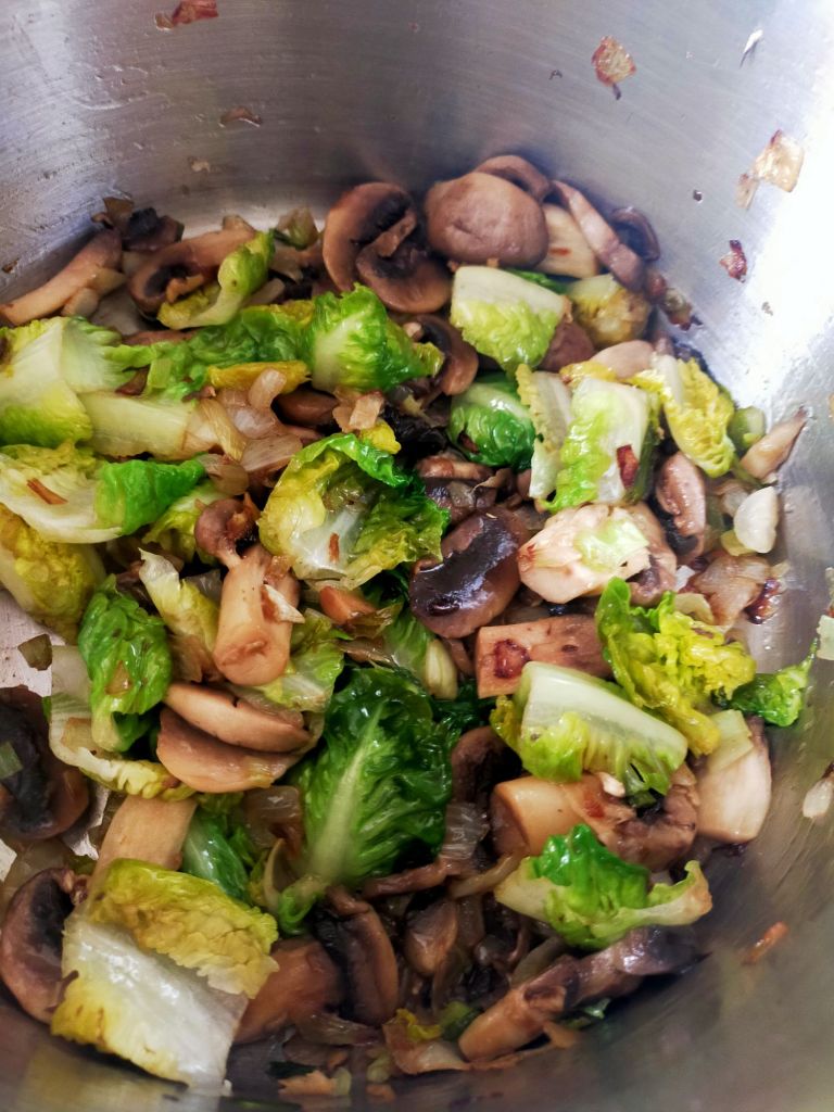 Exceptionnellement j’ai pris des feuilles de sucrine pour remplacer le choux chinois de la recette, car je n’en ai pas trouvé. C’était malgré tout délicieux.