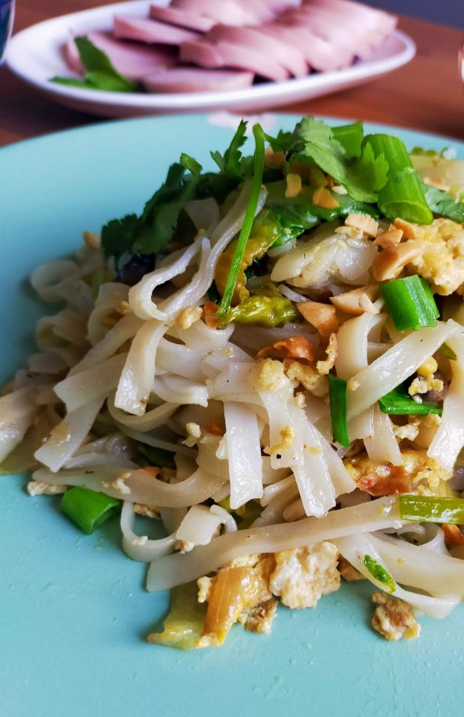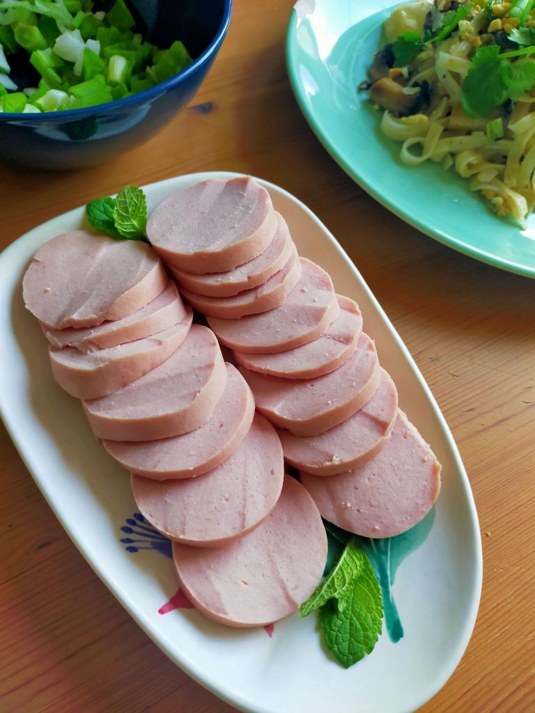 - Avant de servir arroser d’huile de sésame, rajouter la coriandre ciselée, le reste de l’oignon vert et les cacahuètes préalablement concassées. Vous pouvez accompagner cela de saucisson vietnamien. Si vous n’en avez pas sous la main , du cervelas fera très bien l’affaire. Bon appétit!