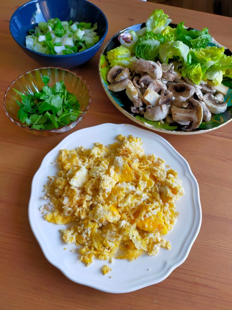 - En attendant, laver et tailler les légumes et les aromates. Préparer une omelette. Réserver le tout au frigo.