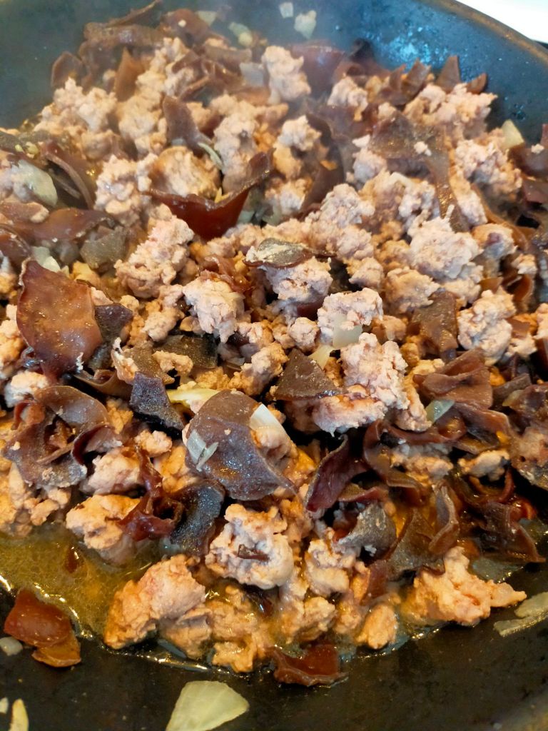 - Ciseler l’oignon et hacher l’ail finement. Faire revenir le porc avec l’ail et l’oignon dans un peu d’huile jusqu’à ce qu’ils deviennent translucides. Rajouter les champignons et la sauce de poisson. Saler et poivrer. Cuire 1 dizaine de minutes en mélangeant régulièrement. Retirer du feu et réserver.