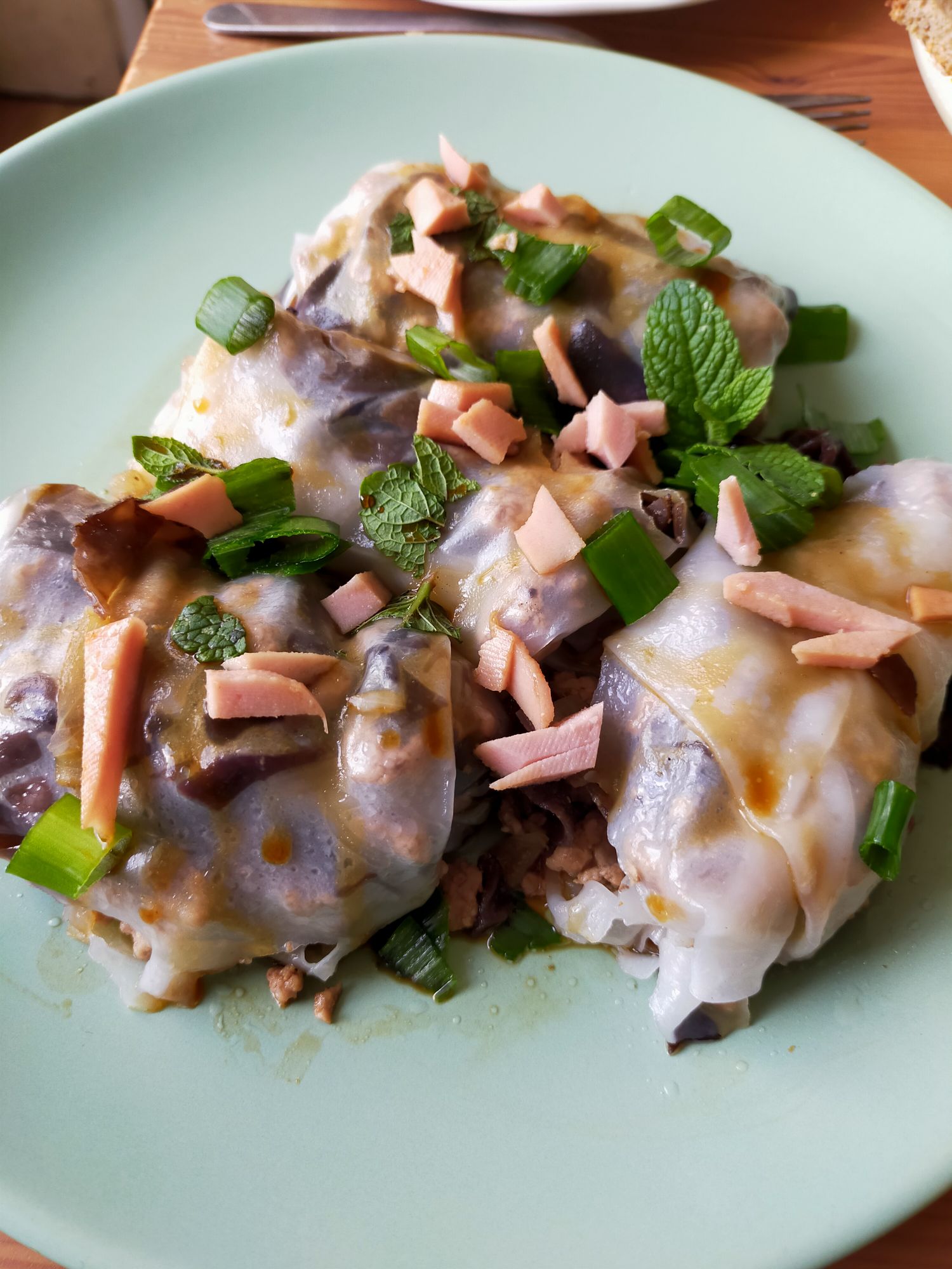 - Les retirer du feu. Les dresser dans une assiette, avec des feuilles de menthe, de coriandre, les lamelles de concombre, et de saucisson vietnamien. Arroser les banh cuon de sauce et finir par l’ajout de l’échalote frite. A table !