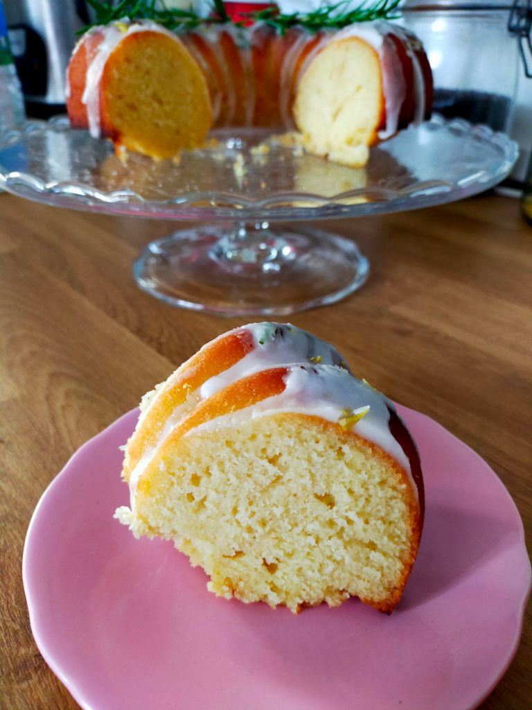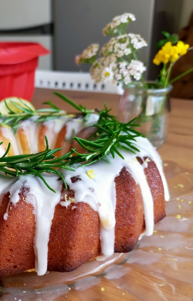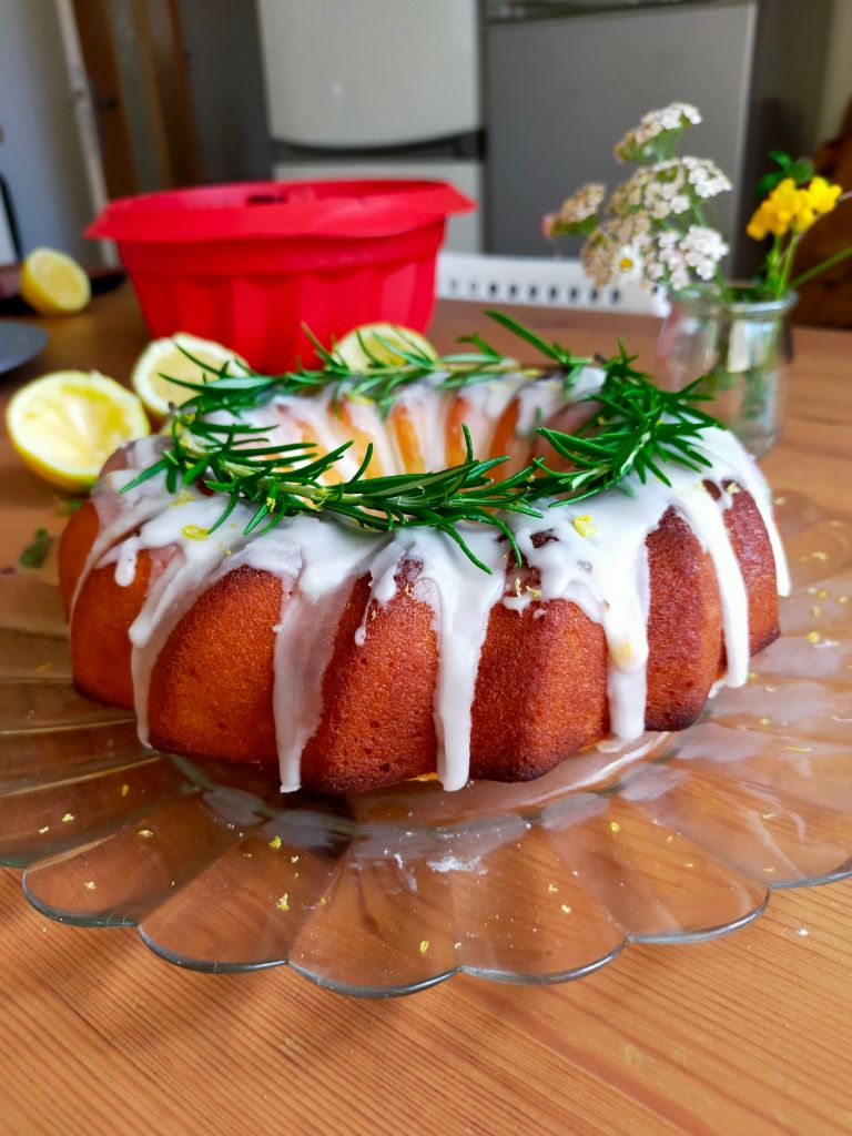 Gâteau à la fleur d’oranger, glaçage au citron et romarin