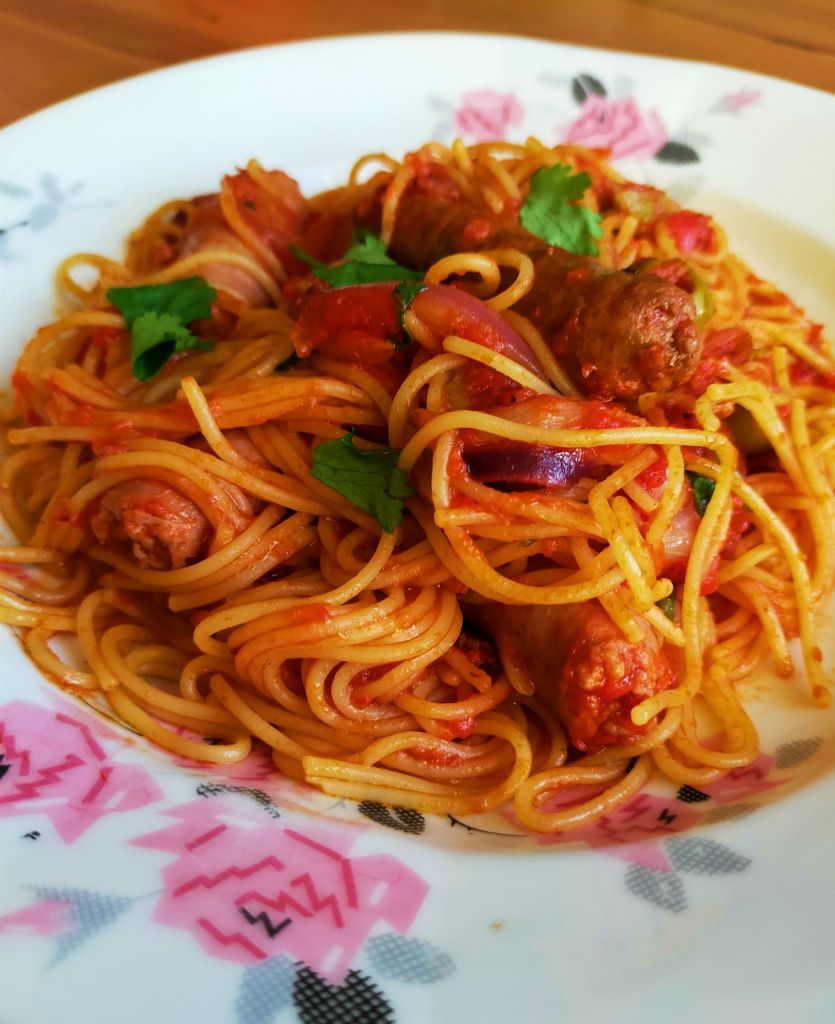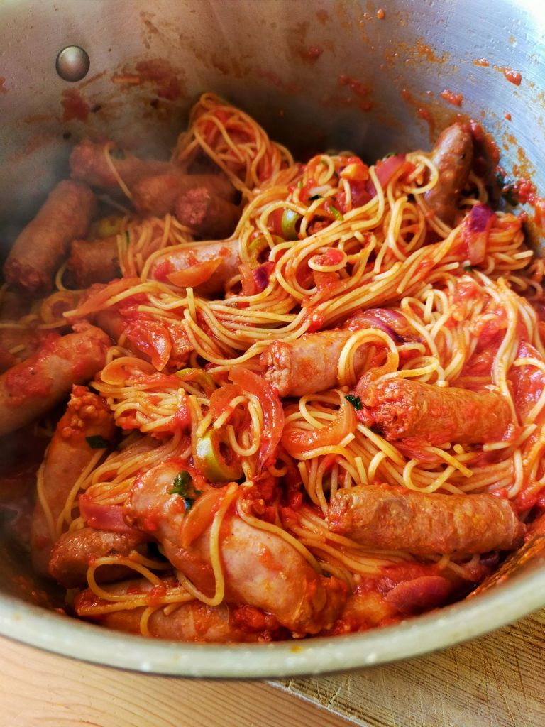 - Couper les saucisses en 2 . Couper le poivrons en petits dès, ainsi que l’oignon rouge.