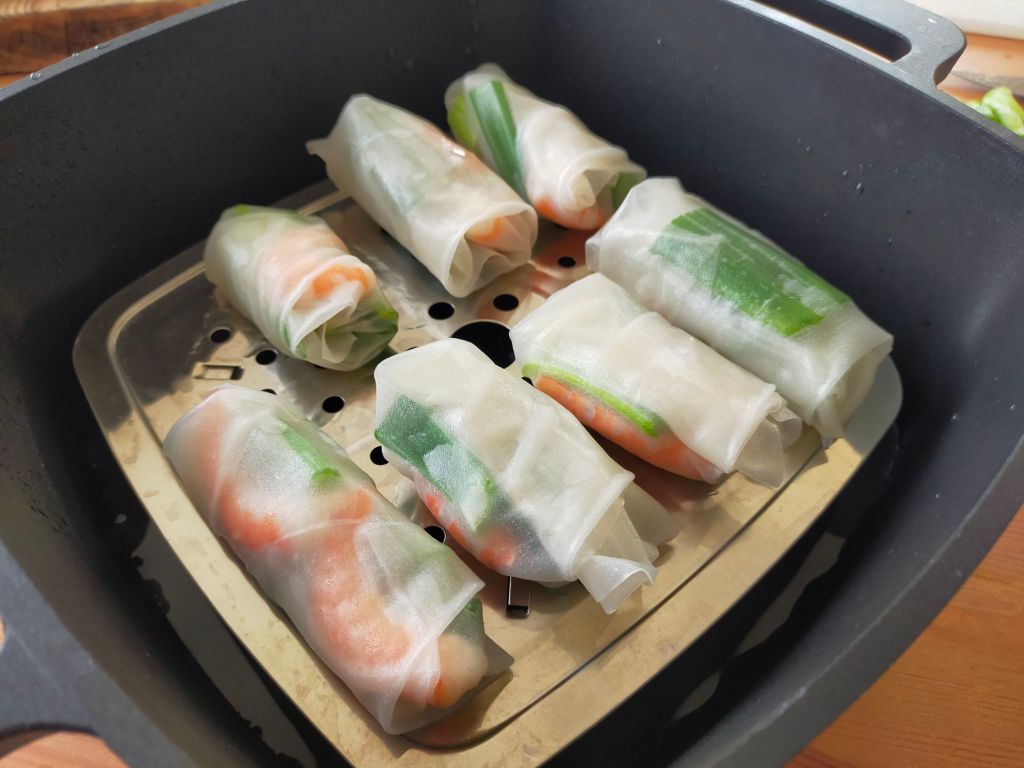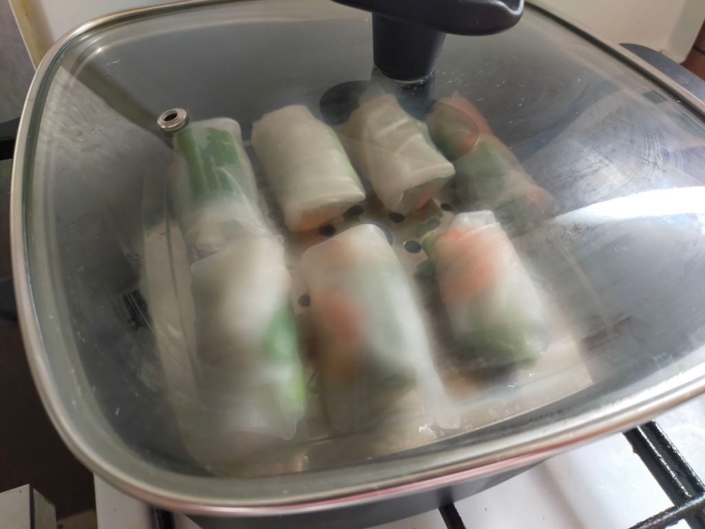 - Une fois roulées, mettre les crêpes farcies dans un cuit vapeur pendant quelques minutes : le temps que les galettes s’épaississent et blanchissent sous l’effet de la vapeur. Elles doivent devenir élastique.