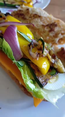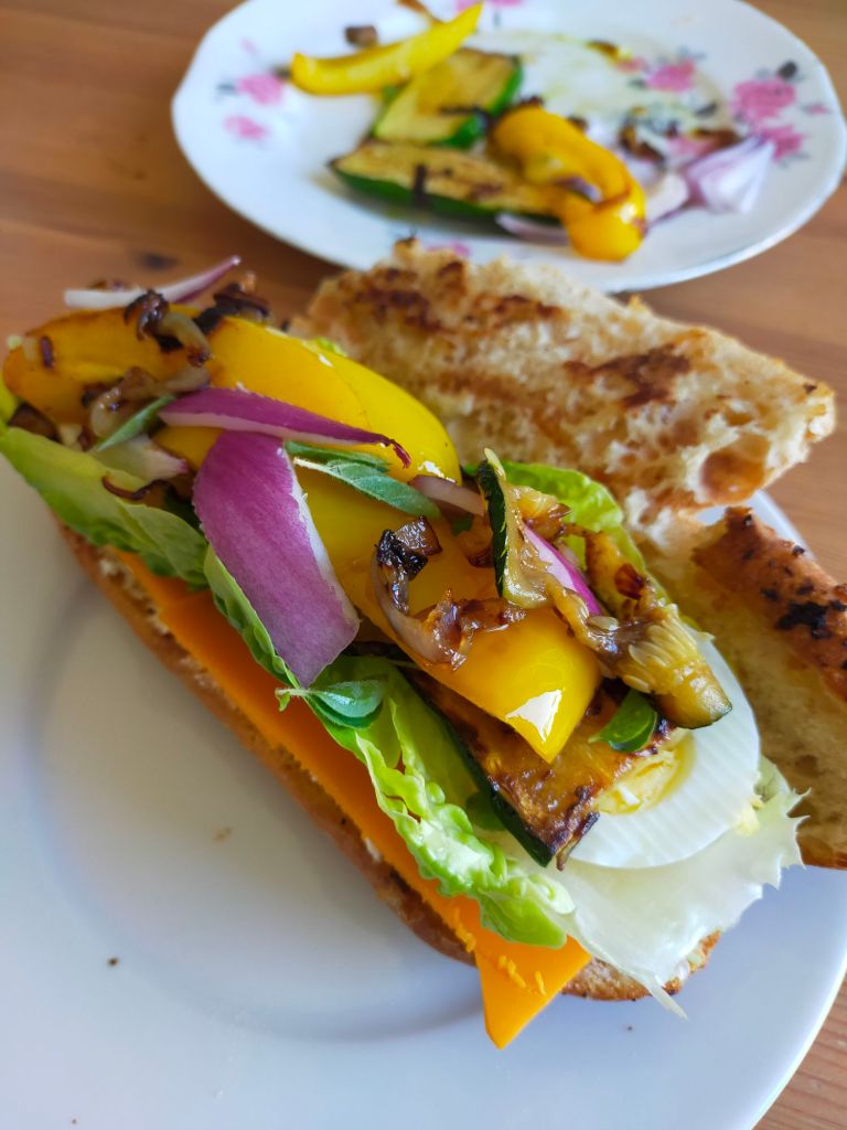 - Commencer le montage : D’abord tartiner le pain de fromage frais. Puis ajouter la tranche de fromage coupée en 2. Puis les feuilles de salade, l’oeuf coupé en 4. Et finir par les légumes grillés. Refermez le sandwich et dégustez !!